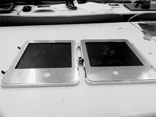 對于功能方面,手寫板的功能有待開發(fā).我們目前只能實現(xiàn)黑白的擦寫,這與一塊普通筆記本無異.未來若有條件,我會考慮加裝藍牙設(shè)備,與電子設(shè)備連接,實現(xiàn)實時儲存,同時可加一些輔助書寫的網(wǎng)格于手寫膜表面.最期待的則是對于手寫板的核心——雙穩(wěn)態(tài)液晶手寫膜的研究,實現(xiàn)手寫板的彩繪功能.