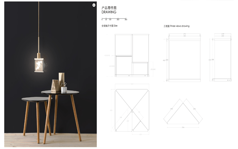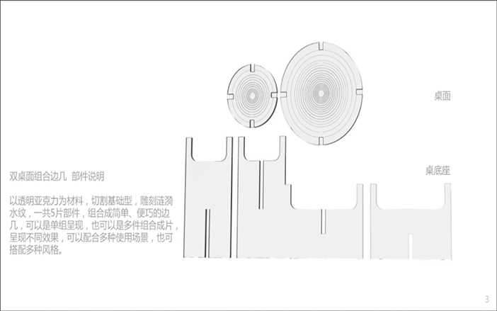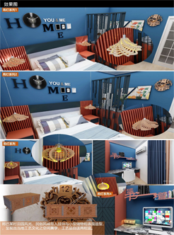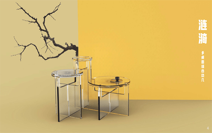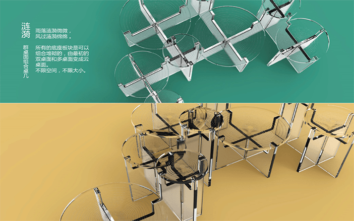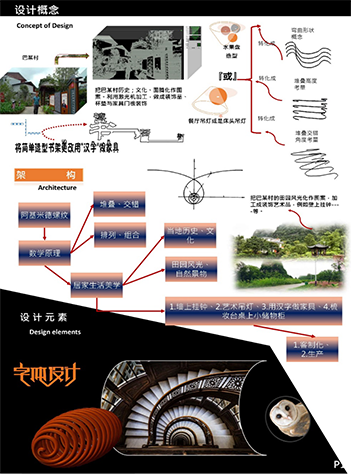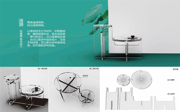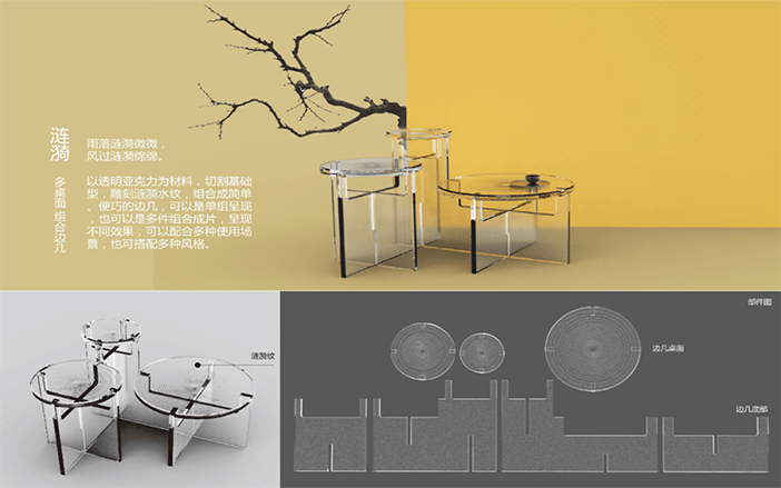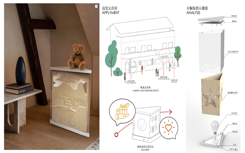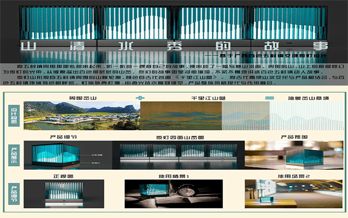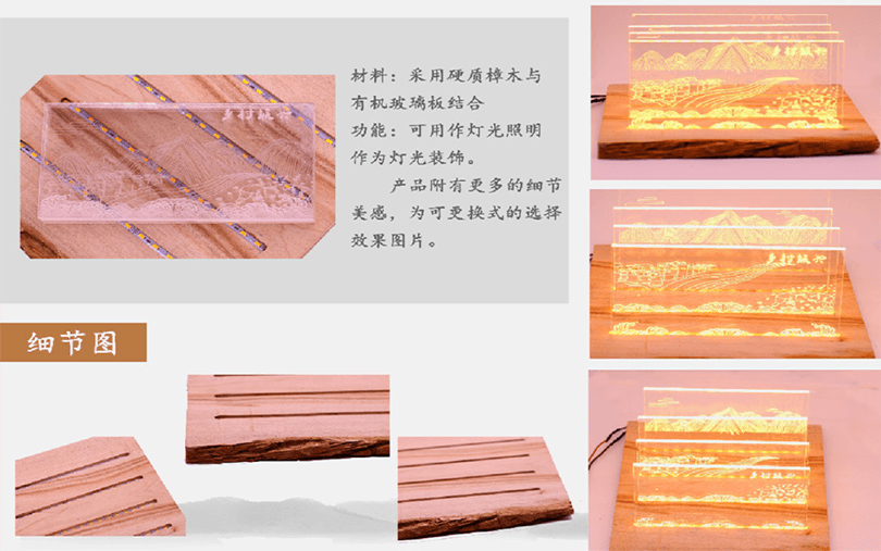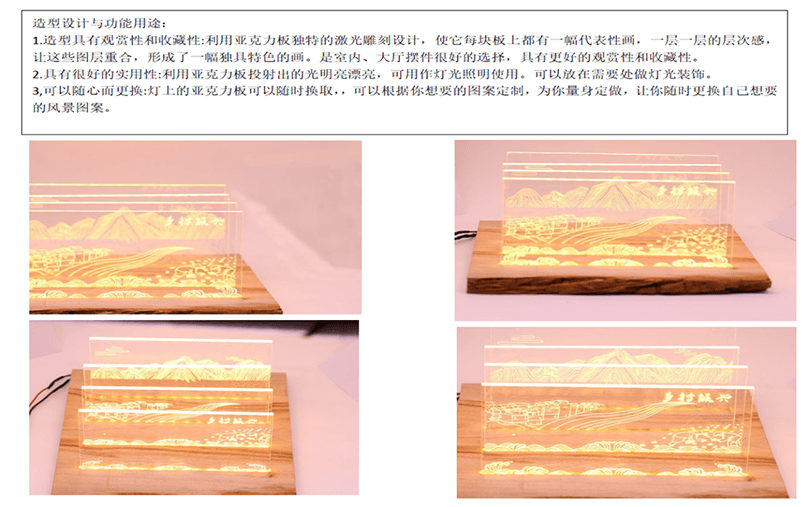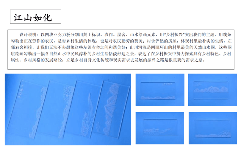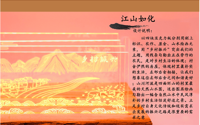 設計說明:四塊亞克力板上刻有標牌、農家、房屋和山水畫等元素。線條勾勒出農民和別墅,反映出簡單的鄉村生活。鄰里相見,表現出和諧美好的人際關系。山脈、河流代表了寧靜舒適的鄉村生活。根據自身的文化傳統和農村的實際需要,探索鄉村振興之路。