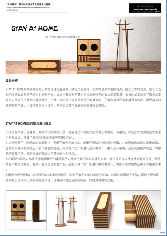 AT HOME系列家具針對巴某村地理位置偏僻、缺乏產業支持,但木材資源豐富的特點,整合了木材資源,結合了當地的民宿設計與特色的鄉村旅游產業,設計一套適合巴某村鄉村旅游特色的板式民宿家具。板材的加工結合了激光加工技術、巴某村的建筑特色和“巴某”二字的簡化,運用并體現于家具當中。以此增加民宿入住率,帶動周邊群眾發展民宿旅游實現增收。