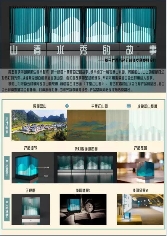 產品介紹:夜燈山形取自五村鎮周圍的山脈輪廓,顏色取自古代名畫《千里江山圖》,將古代青山綠水文化與產品相結合,與百色五村鎮地域特色相呼應。燈體外殼欄柵,有激光技術雕刻鏤空,產品整體風格現代與傳統融合。