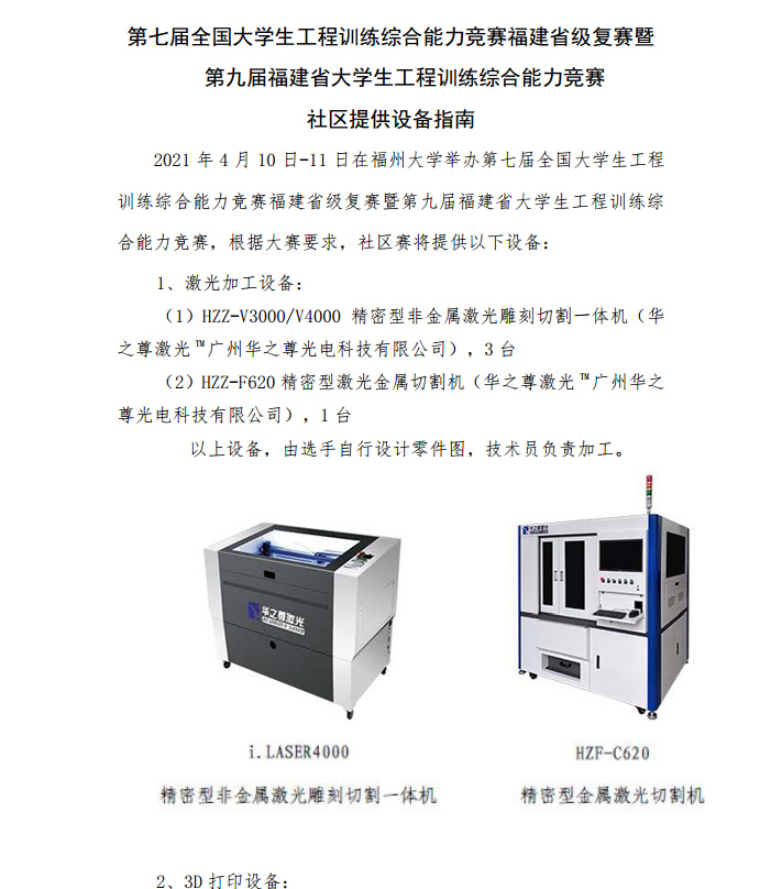 4月10日,第七屆全國大學(xué)生工程訓(xùn)練綜合能力競賽福建省級復(fù)賽暨第九屆福建省大學(xué)生工程訓(xùn)練綜合能力競賽在福州大學(xué)開賽啦!!!本屆大賽主題——“守德崇勞工程創(chuàng)新求卓越,服務(wù)社會(huì)智造強(qiáng)國勇?lián)?dāng)”。華之尊激光榮幸受邀成為本次大賽激光加工設(shè)備唯一供應(yīng)商。為大賽提供激光加工設(shè)備和激光加工技術(shù)支持。