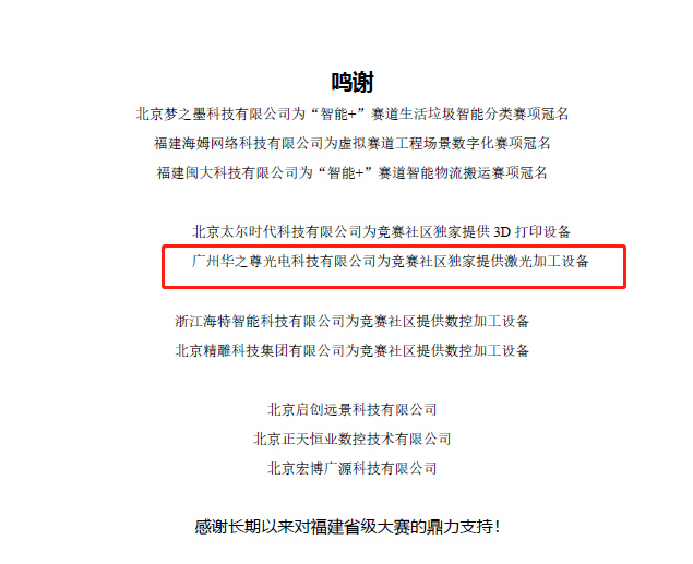 感謝福建省大學(xué)生工程訓(xùn)練綜合能力競賽組委會(huì)的信任,從廈門理工開始、廈門大學(xué)嘉庚學(xué)院、莆田學(xué)院,再到今年的福州大學(xué),已連續(xù)多年使用我司金屬、非金屬激光設(shè)備做為獨(dú)家激光加工設(shè)備,我們一定不負(fù)所托,為大賽保駕護(hù)航。