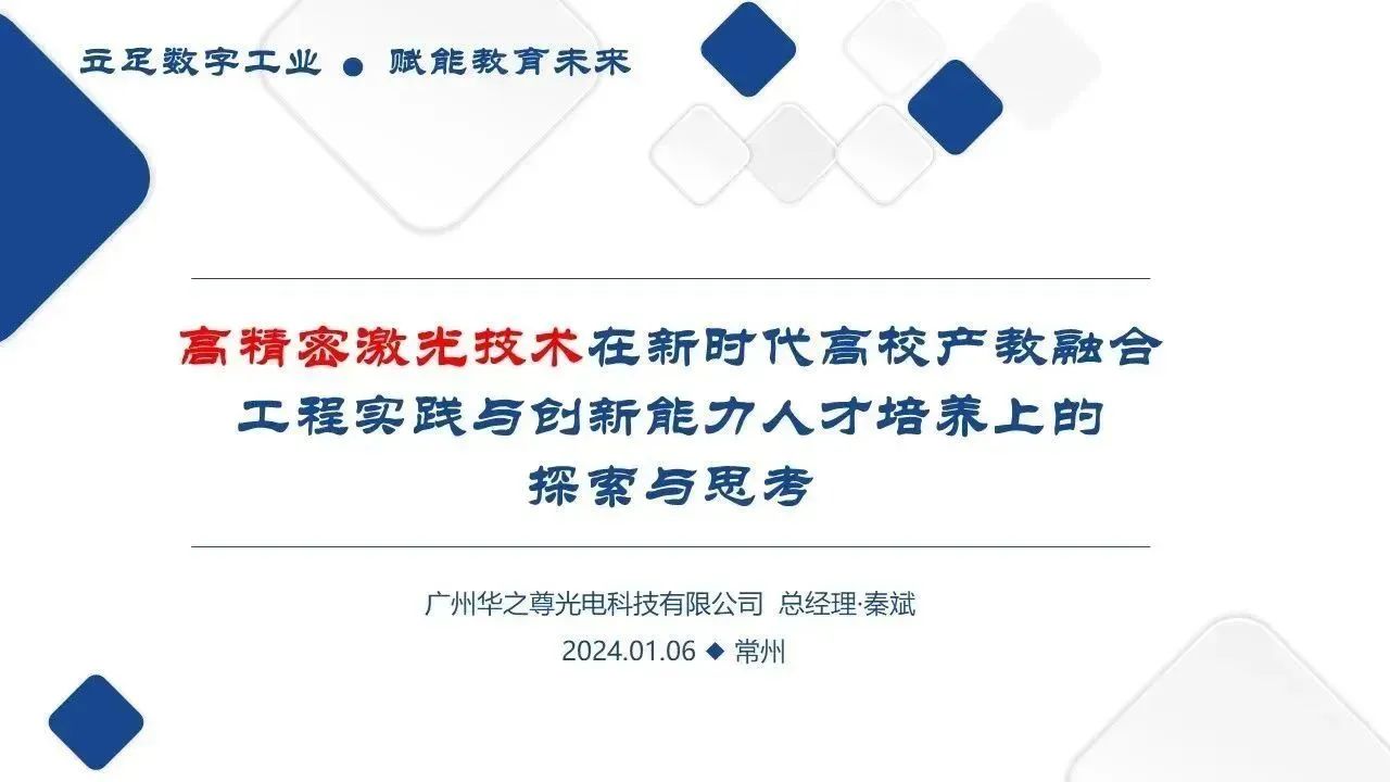廣州華之尊光電科技有限公司總經理秦斌在會議現場以《高精密激光技術在新時代高校產教融合工程實踐與創新能力人才培養上的探索與思考》為題,作了會議報告。