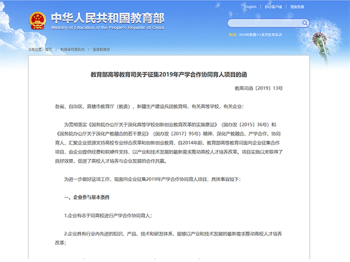 教育部高等教育司關于公布有關企業支持的產學合作協同育人項目申報指南(2019年第一批)的通知